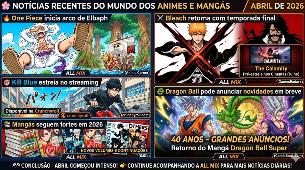 O universo dos animes e mangás segue movimentado em abril de 2026, com grandes estreias, novos anúncios e retornos aguardados pelos fãs. Confira os destaques mais recentes da semana na All Mix.